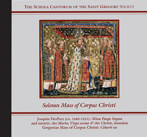The third in our acclaimed series of recordings presents the music for Solemn Mass of Corpus Christi, featuring polyphonic masterpieces by Josquin DesPrez, the great Franco-Flemish composer whose work inaugurated the musical High Renaissance. Included are Josquin’s Missa Pange lingua, his motets Ave Maria…Virgo serena and Ave Christe, immolate, along with the Gregorian chants proper to this beloved feast.